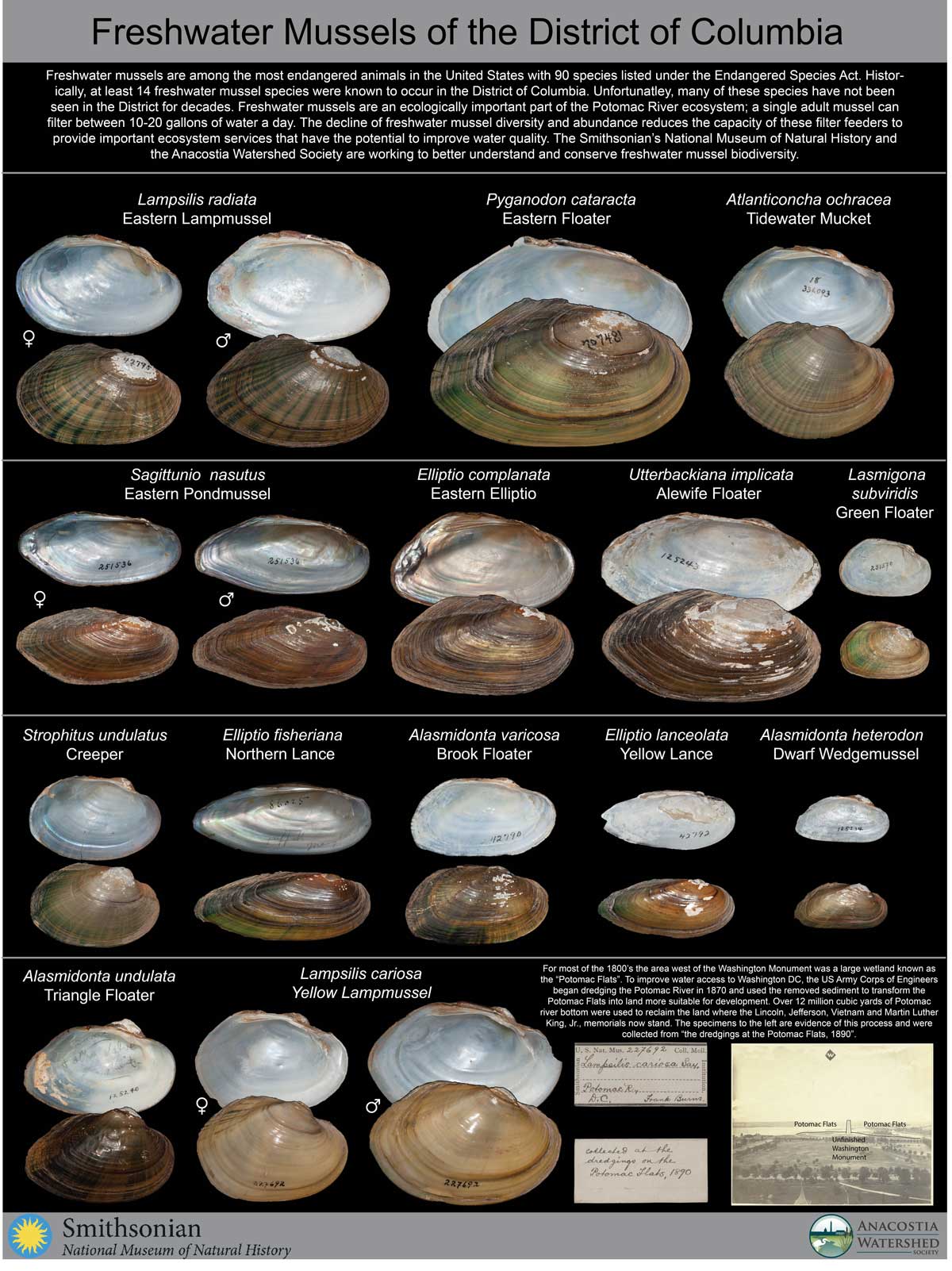 A new poster done in collaboration with the Smithsonian showing the freshwater mussel species of the Anacostia River.